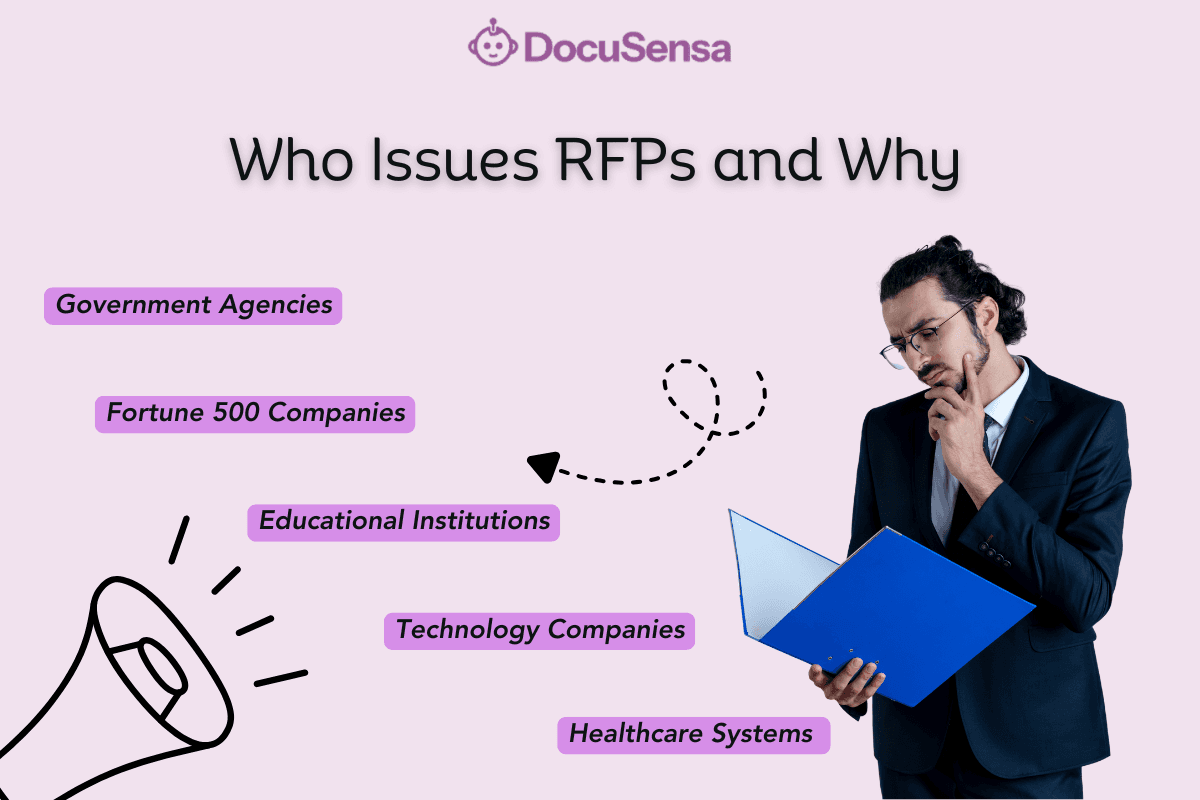 Understanding who's issuing the RFP shapes your response strategy. Government RFPs prioritize strict compliance. Corporate RFPs emphasize ROI and implementation speed. Healthcare RFPs require security certifications.